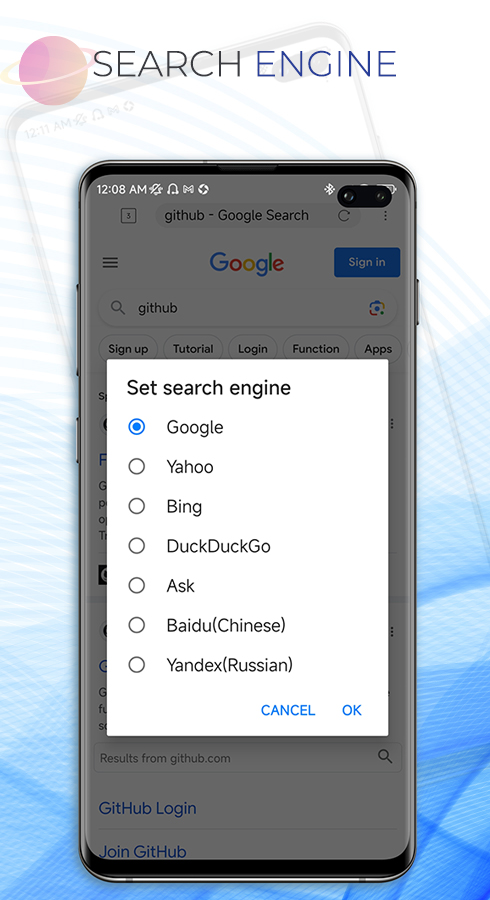 It Incognito Browser supports multiple search engine including Google, Bing, Yandex, Yahoo. Which is the default, but you can change in settings .